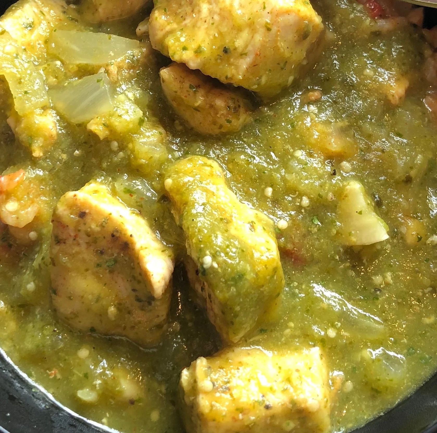 This week I’d like to share one of my favorite recipes, chile verde (that’s Spanish for “green chile," one of the main ingredients). This delicious stew-like dish can be eaten on its own. But I like to keep it as a staple in the fridge and put the delicious green sauce on other foods when I need to take the flavor up another level. Try it on eggs, veggies, potatoes, rice, and more.